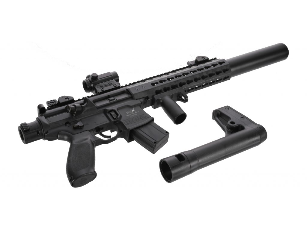 Rukojeť pušky je vyrobena z polymeru. Lučík i spoušť je z kovu. Namáčknutí je velice příjemné, a opravdu připomína chod reálné zbraně. Manuální kovová pojistka je umístěná na levé straně a je v přesném dosahu palce při střelbě. Zásobník MCX je vyroben z polymeru. Sig Sauer, zde velmi netradičně pojal nabíjení diabolek, které se vkládájí do pásku a teprve poté vložíte do zásobníku. Samotná kapacita je 30 diabolek.
